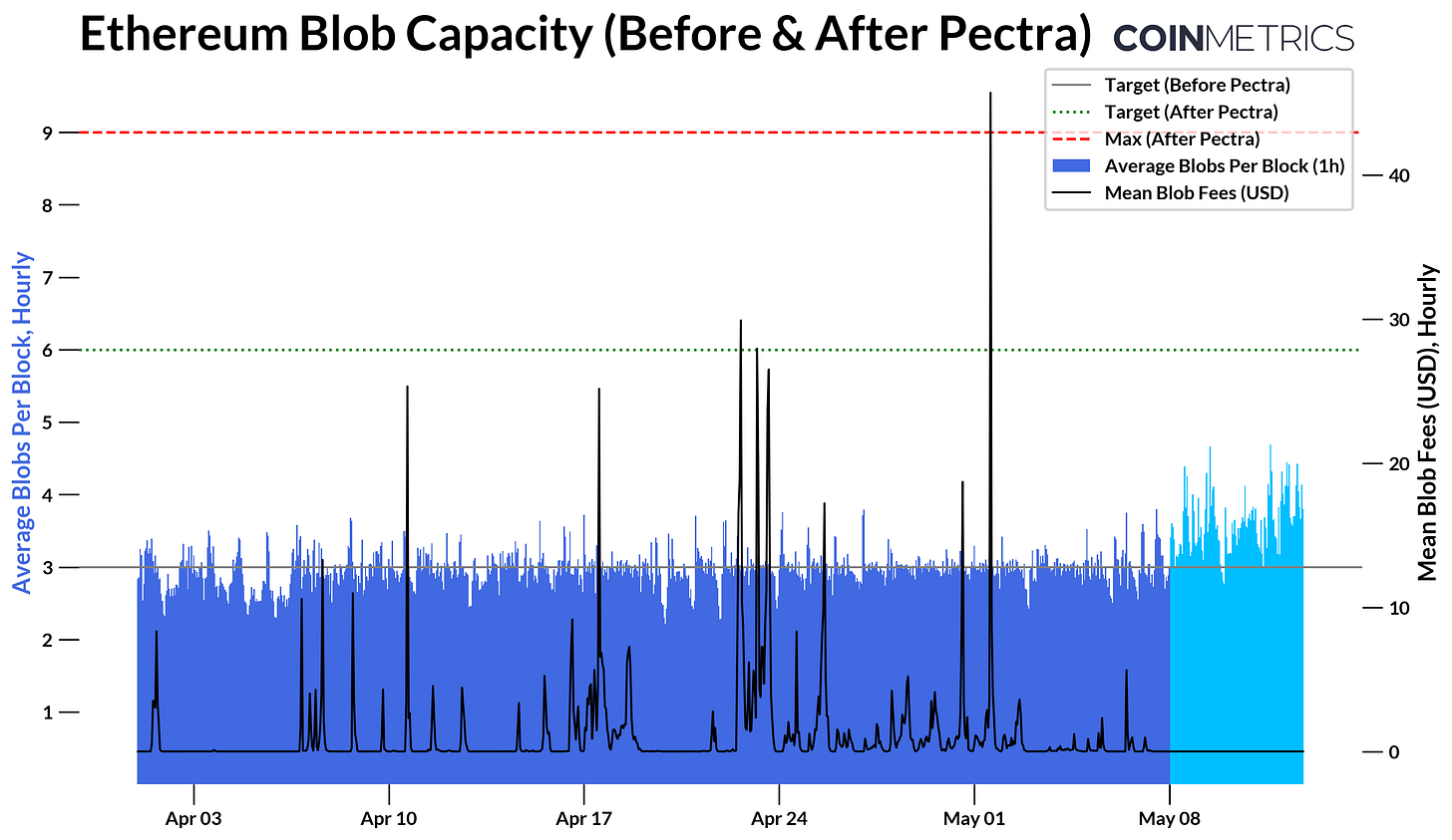 Ethereum’s Pectra Laborious Fork se lanzó con éxito el 8 de mayo, implementando una gama de actualizaciones que incluyen mejoras de validador (EIP-7251), mejoras de experiencia de usuario UX con cuenta inteligente (EIP-7702) y escala de blob. EIP-7691 duplicó el rendimiento del blob de Ethereum, aumentando el objetivo a 6 y máximo de 9 blobs por bloque.