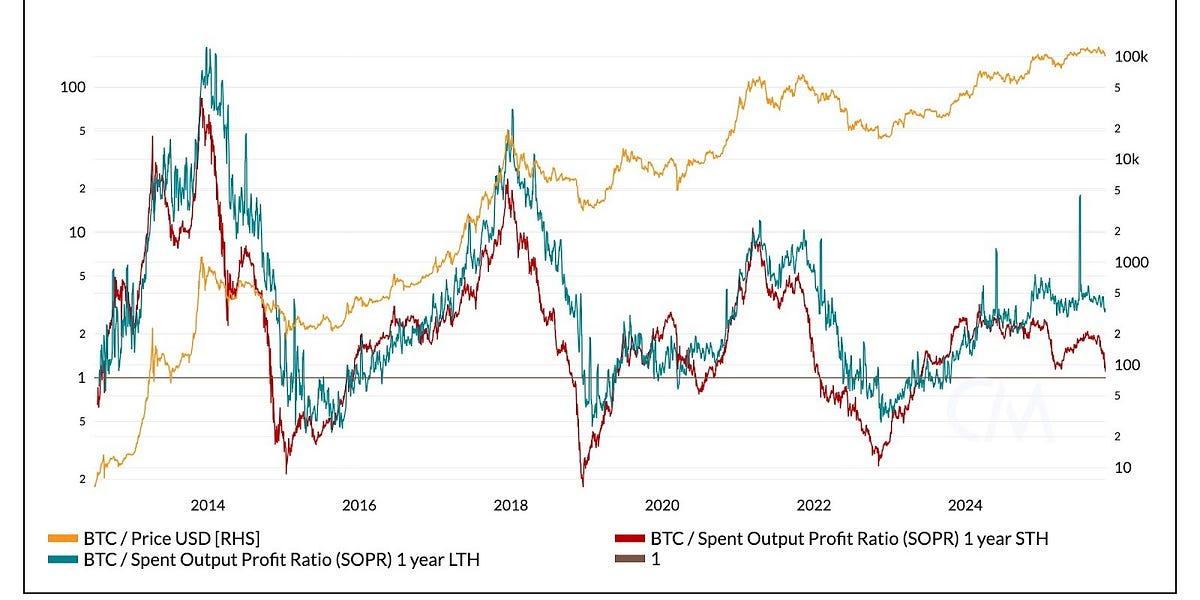 En ciclos anteriores, los tenedores tanto a largo como a corto plazo tendían a obtener ganancias y pérdidas en oscilaciones bruscas y sincronizadas. Más recientemente, esta relación ha divergido. El SOPR del tenedor a largo plazo se mantiene modestamente por encima de uno, lo que sugiere una obtención constante de ganancias y una distribución mesurada hacia la fortaleza.