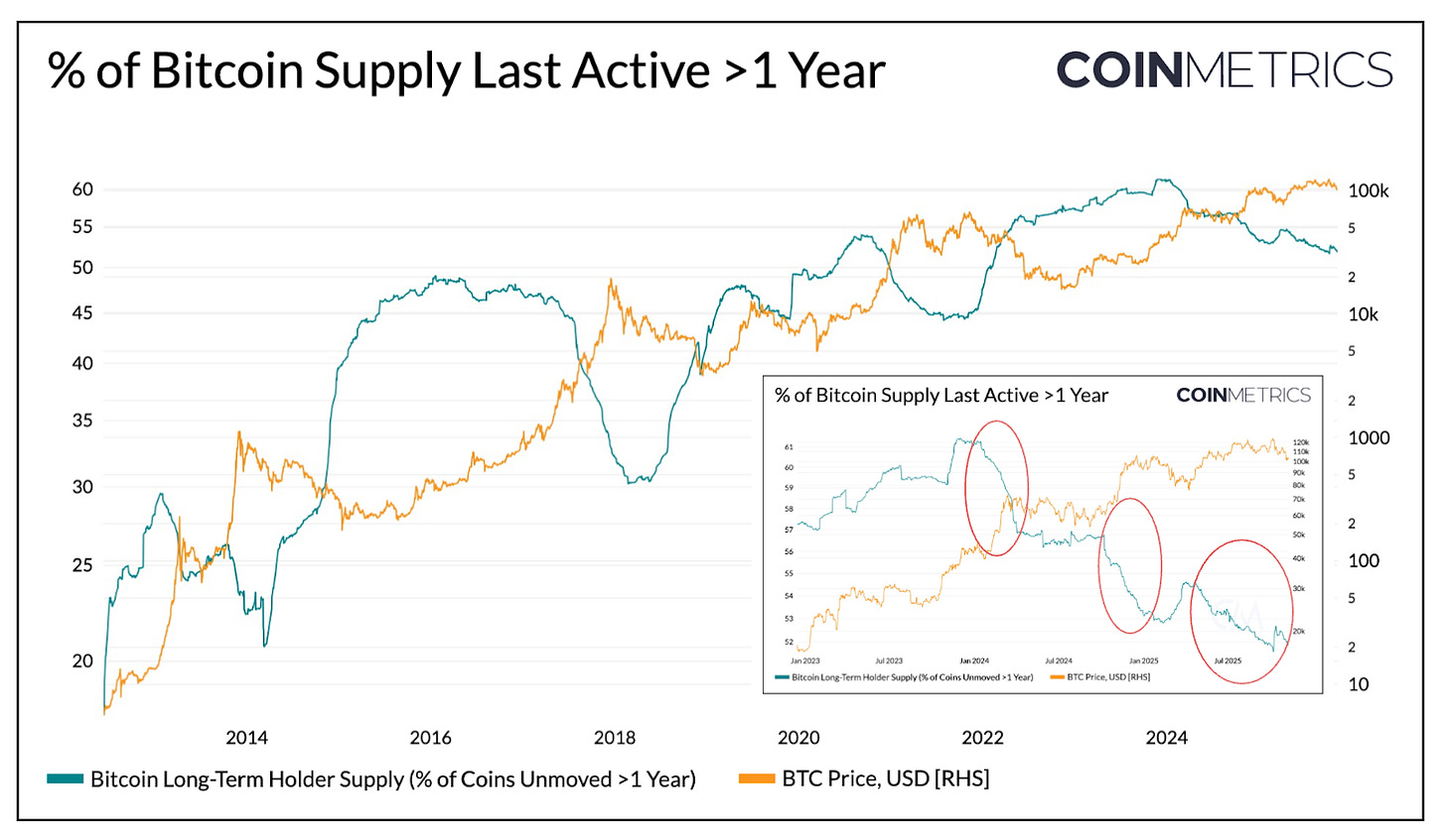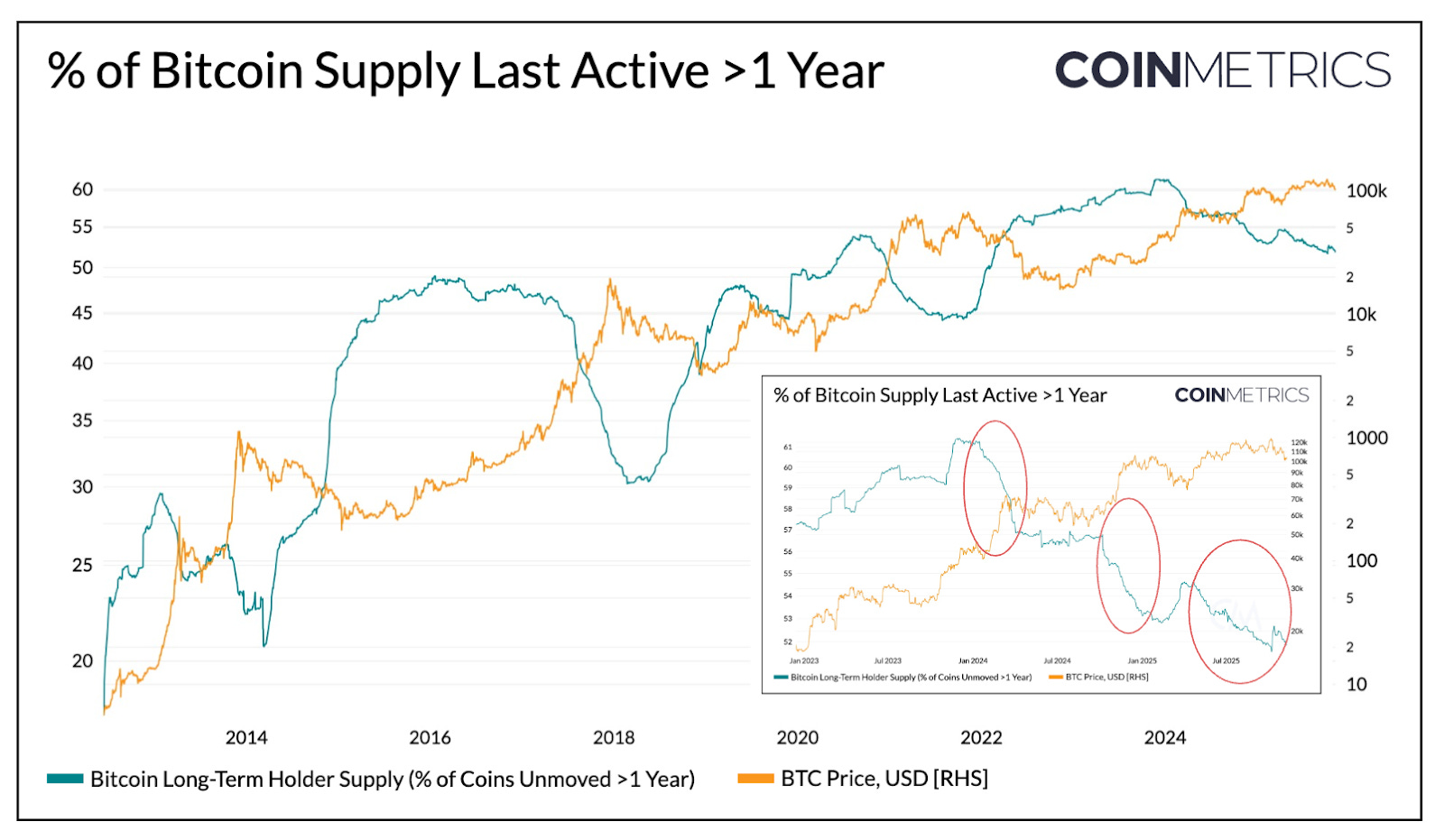 Hoy en día, aproximadamente el 52% de los 19,94 millones de oferta circulante de Bitcoin ha permanecido inactivo durante más de un año, en comparación con alrededor del 61% a principios de 2024. Tanto la magnitud de los aumentos durante los mercados bajistas como las disminuciones durante los mercados alcistas se han moderado notablemente, con oleadas graduales de distribución que se produjeron en el primer y tercer trimestre de 2024 y, más recientemente, en 2025. Esto sugiere que los tenedores a largo plazo están distribuyendo de una manera más sostenida, lo que refleja una transición de propiedad más prolongada.