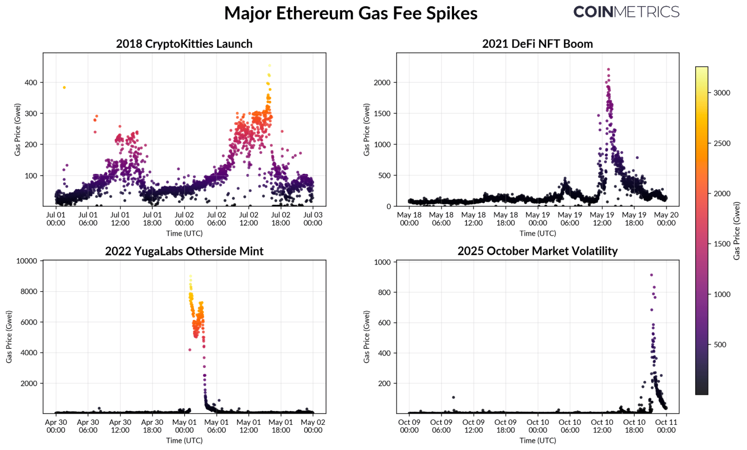 • Liquidaciones del Mercado de Octubre de 2025: Si bien también se han producido picos en ocasiones más recientes, como el lanzamiento del token WLFI y las liquidaciones del 10 de octubre, han sido mucho más contenidos. Las tarifas rara vez superaron los 1.000 Gwei y se normalizaron rápidamente, lo que refleja el impacto de las L2 y los aumentos continuos de la capacidad de la Capa 1.