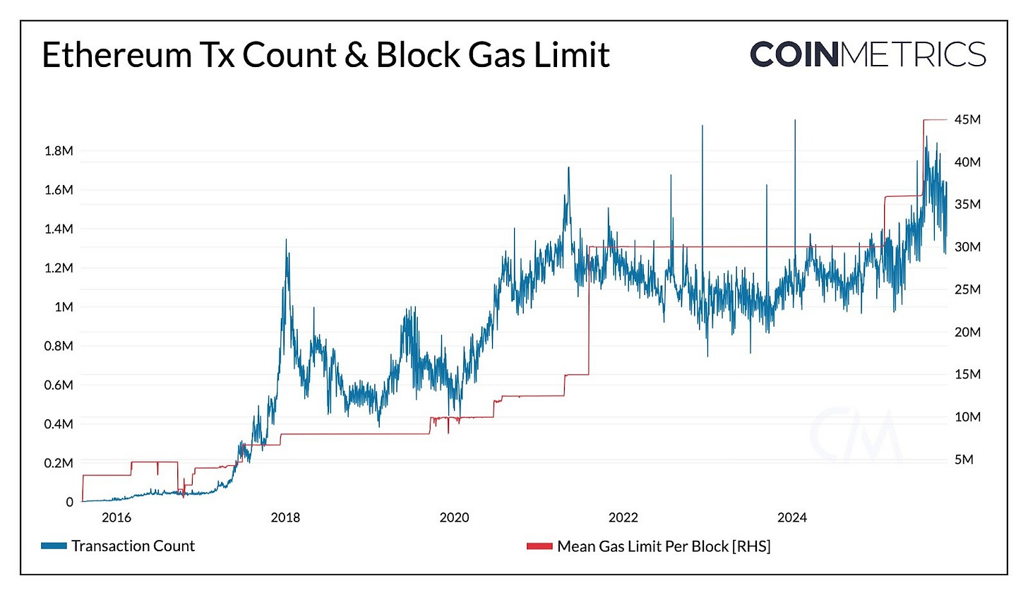 Las transacciones diarias en Ethereum superaron los 1,8 millones en 2025, mientras que las tarifas de transacción promedio están en mínimos de varios años. Como se muestra a continuación, el límite de gasoline se elevó recientemente a forty five millones, con planes de llegar a 100 millones y más para respaldar mayores volúmenes de transacciones a medida que aumenta la actividad.