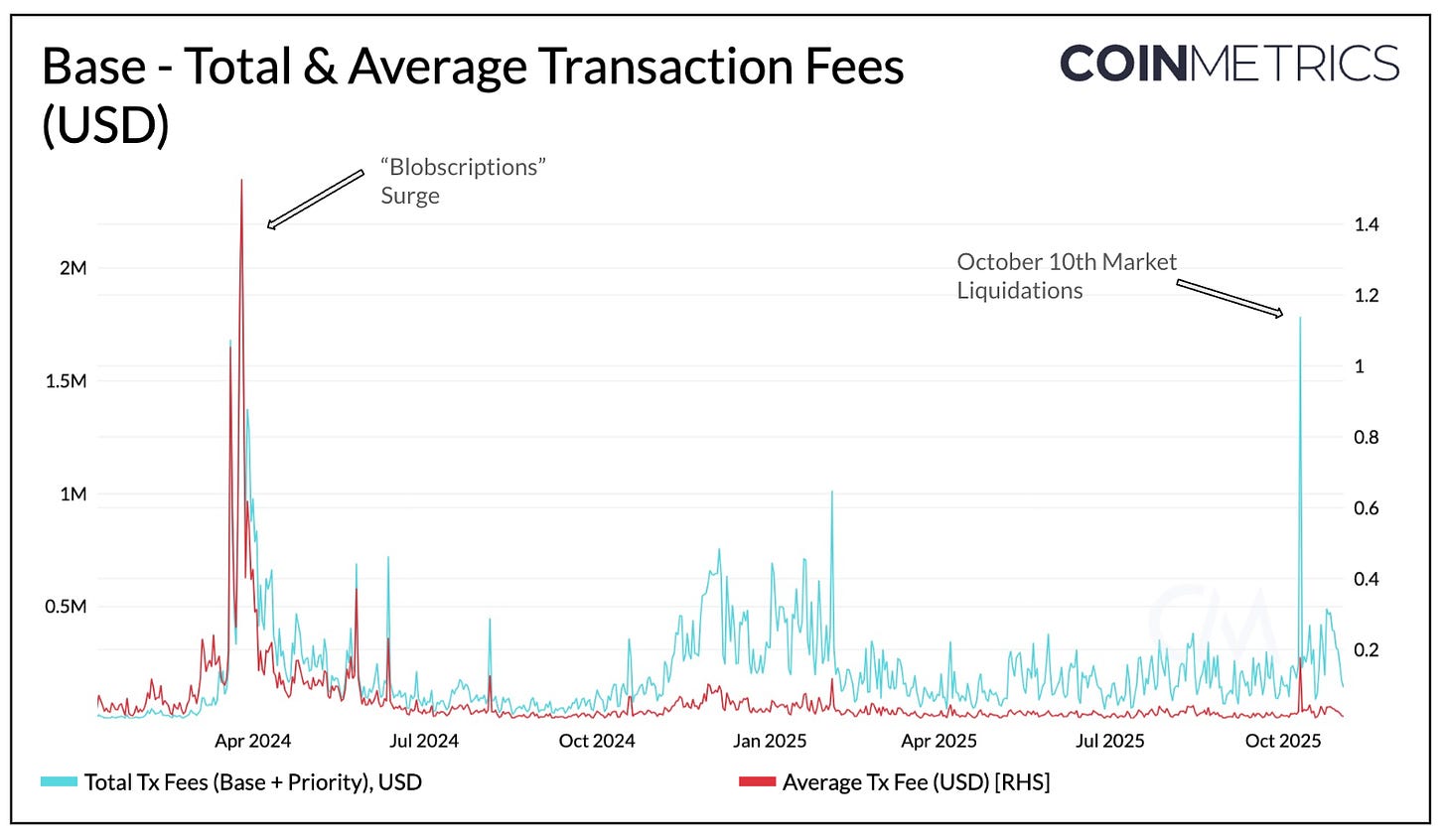 • Octubre 2025 Liquidaciones de Mercado: Durante la volatilidad del mercado del 10 de octubre, Base generó casi $1,8 millones en tarifas de transacción totales a medida que aumentó la actividad de liquidación. Sin embargo, los costos promedio de transacción se mantuvieron por debajo de 0,20 dólares. Dado que la actualización de Pectra duplicó la capacidad de los blobs a principios de ese año, las tarifas de los blobs se mantuvieron bajas, lo que permitió a Base procesar un gran volumen sin aumentar los costos para el usuario.