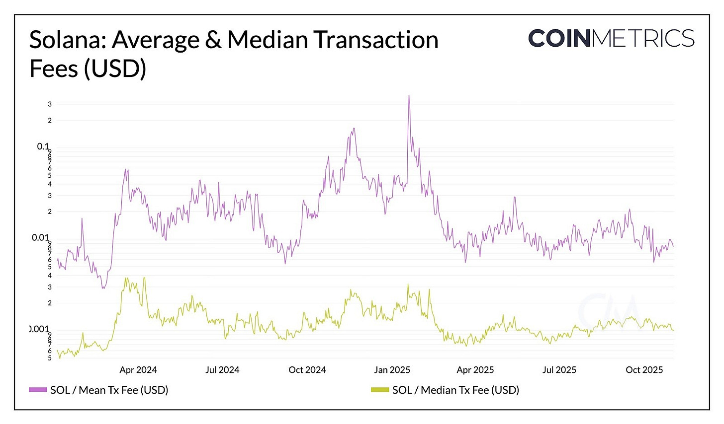 • El diseño de alto rendimiento de Solana localiza la congestión sin depender de capas de escala externas. Durante el lanzamiento del token TRUMP en enero de 2025, las tarifas promedio aumentaron a $0,37, mientras que las tarifas medianas se mantuvieron por debajo de $0,003, lo que pone de relieve cómo los mercados de tarifas locales aíslan la congestión sin aumentar los costos en toda la pink.