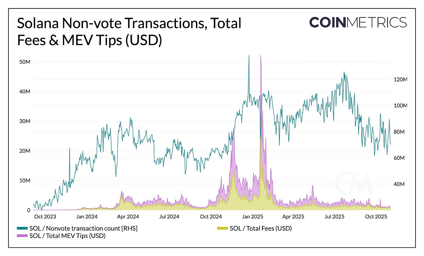 El siguiente cuadro muestra la actividad de transacciones sin voto de Solana (azul) junto con las tarifas de transacción y los consejos MEV fuera de protocolo (amarillo y morado). Juntos, ilustran cómo la demanda de transacciones y los ingresos de la pink han evolucionado con los cambios en la actividad de los usuarios y las condiciones del mercado a lo largo del tiempo.
