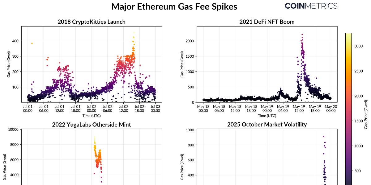 • Liquidaciones del Mercado de Octubre de 2025: Si bien también se han producido picos en ocasiones más recientes, como el lanzamiento del token WLFI y las liquidaciones del 10 de octubre, han sido mucho más contenidos. Las tarifas rara vez superaron los 1.000 Gwei y se normalizaron rápidamente, lo que refleja el impacto de las L2 y los aumentos continuos de la capacidad de la Capa 1.