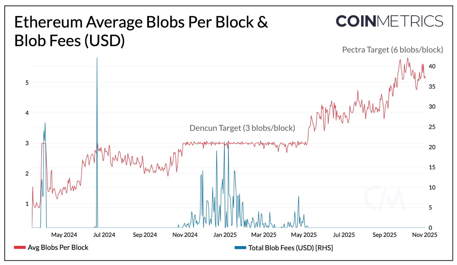 Los picos en las tarifas de los blobs, como los observados en abril de 2024, y los primeros períodos de 2025 se produjeron cuando la demanda superó la capacidad inicial cuando se introdujo por primera vez el espacio de los blobs. Desde entonces, las actualizaciones posteriores, incluidas Pectra y la próxima Fusaka, han estabilizado los precios de los blobs y han creado una capa de datos más versatile para un crecimiento continuo de la L2.